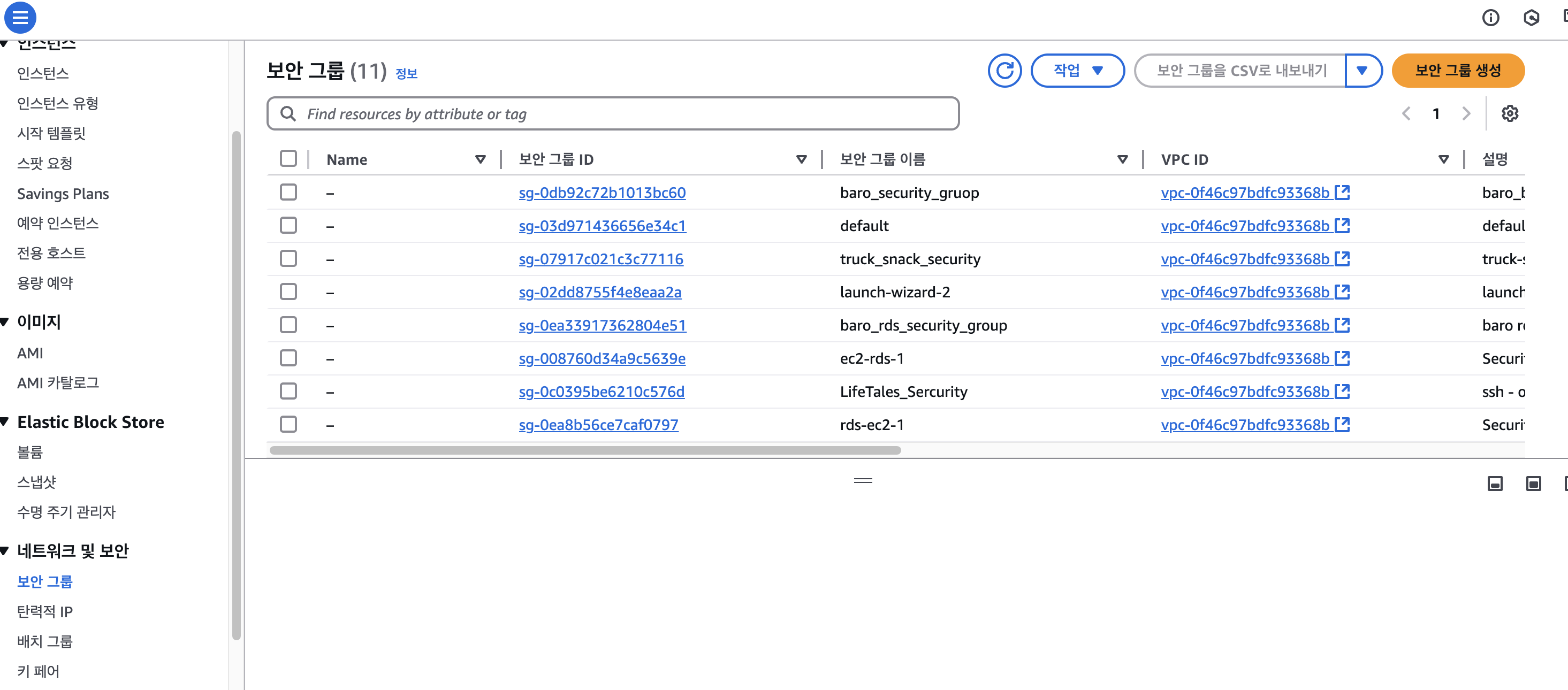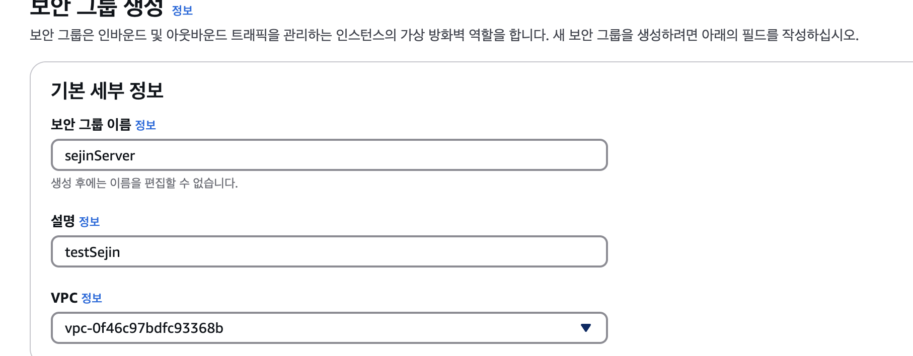 그리고 일단 AWS를 다른 창을하나 킨다음에 보안 그룹을 만듭니다.
