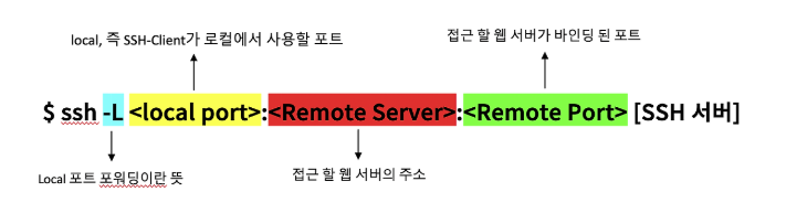 ssh -L <로컬 포트>:<원격 서버 주소>:<원격 서버 포트> <SSH 서버>