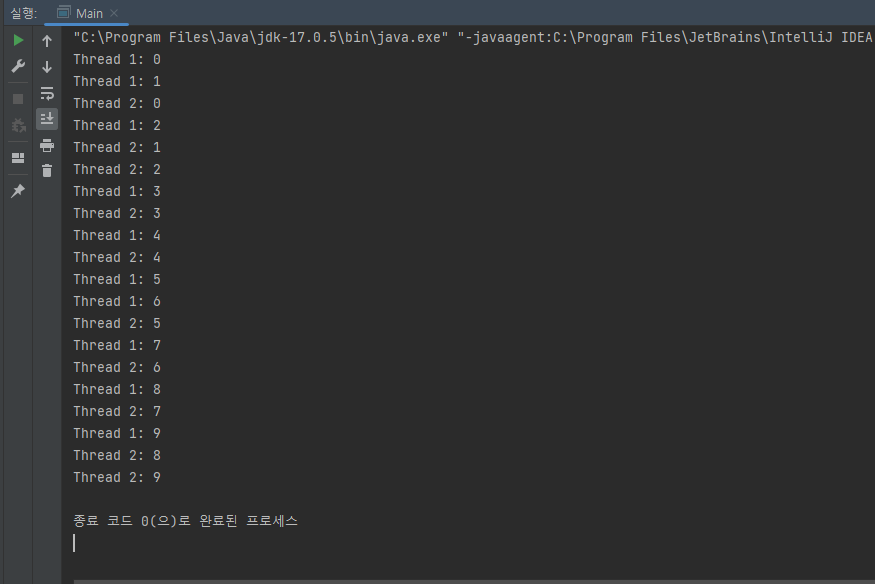 순서대로 나오지 않고 , 섞여 있는 모습을 볼 수 있는데 스레드를 생성해 동시에 작업을 진행하였기 때문입니다.