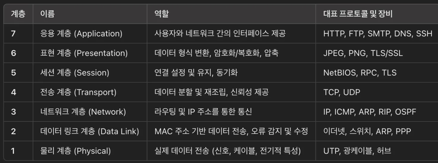 OSI 7계층(Open Systems Interconnection Model)은 네트워크 통신을 계층별로 나누어 설명하는 모델